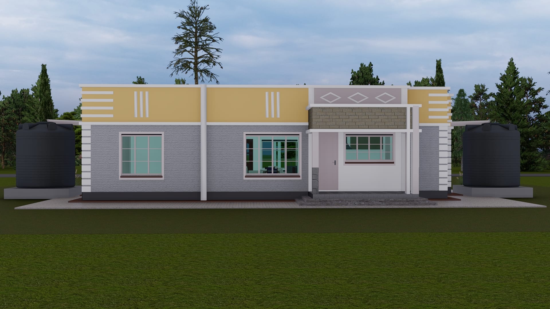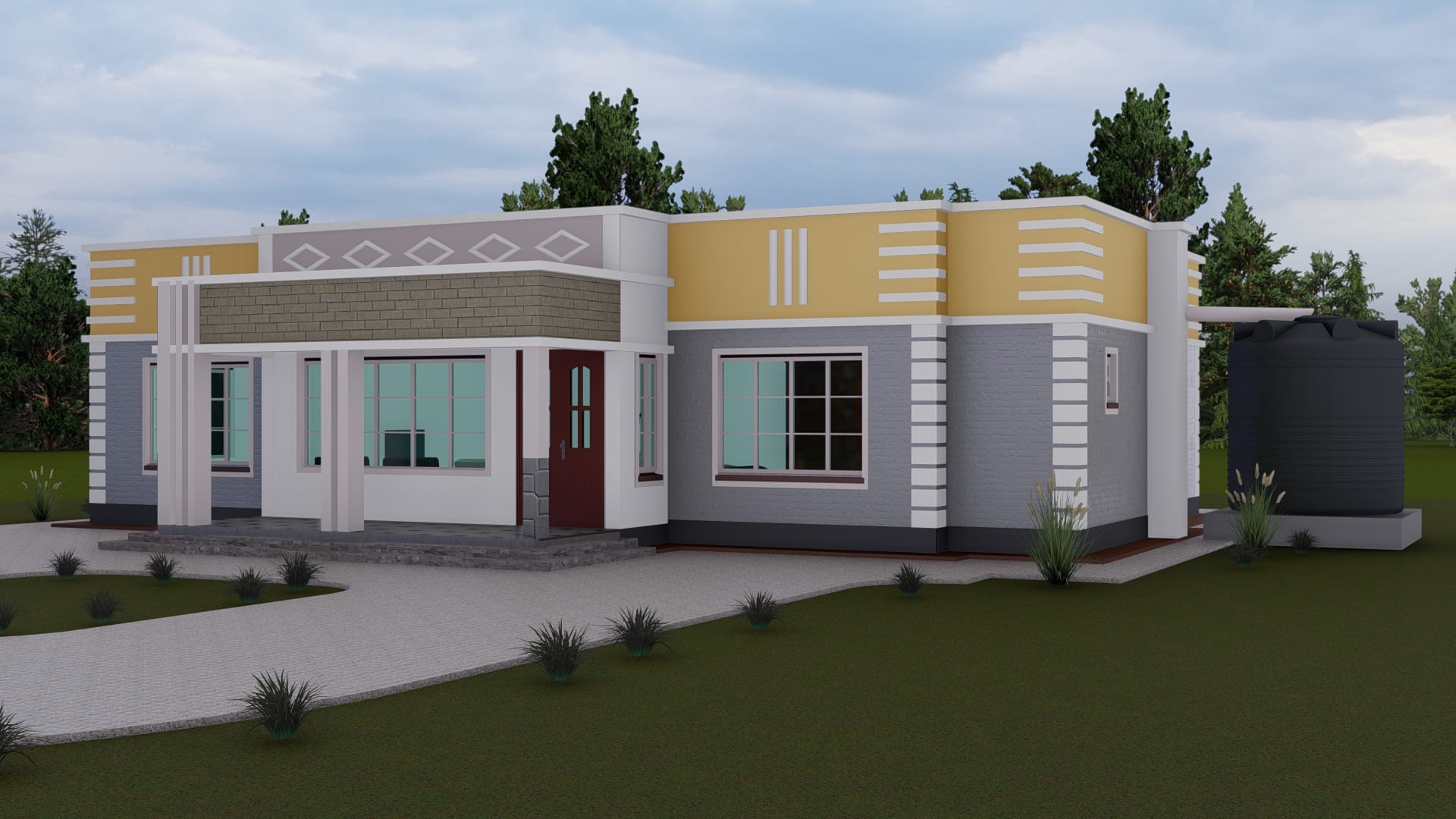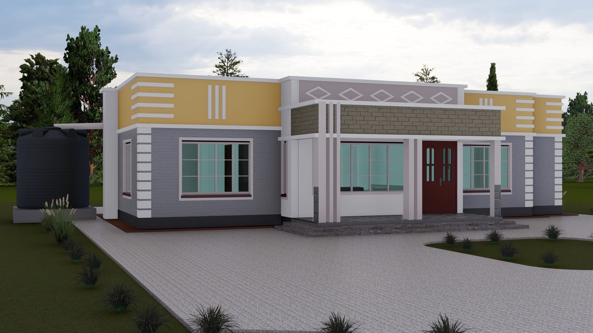 The house plan features a mix of modern finishes with clean lines and textural details, ensuring both aesthetic appeal and structural integrity. These design elements enhance the visual impression while ensuring longevity.
